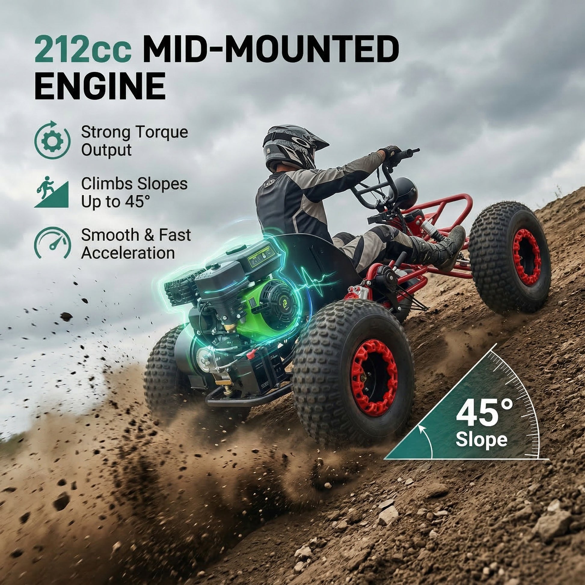 This 212cc 4-stroke gas powered go kart is an off road go kart built as an adult go kart (go kart for adults) that also fits teens. Smooth pull from a cvt go kart drivetrain with CVT belt drive + 420 chain, plus Forward/Neutral/Reverse to turn around and back out easily on tight trails. Up to 45MPH (varies). Rider height: 4'7"–6'7" (1.4–2.0 m). 600 lb max load.