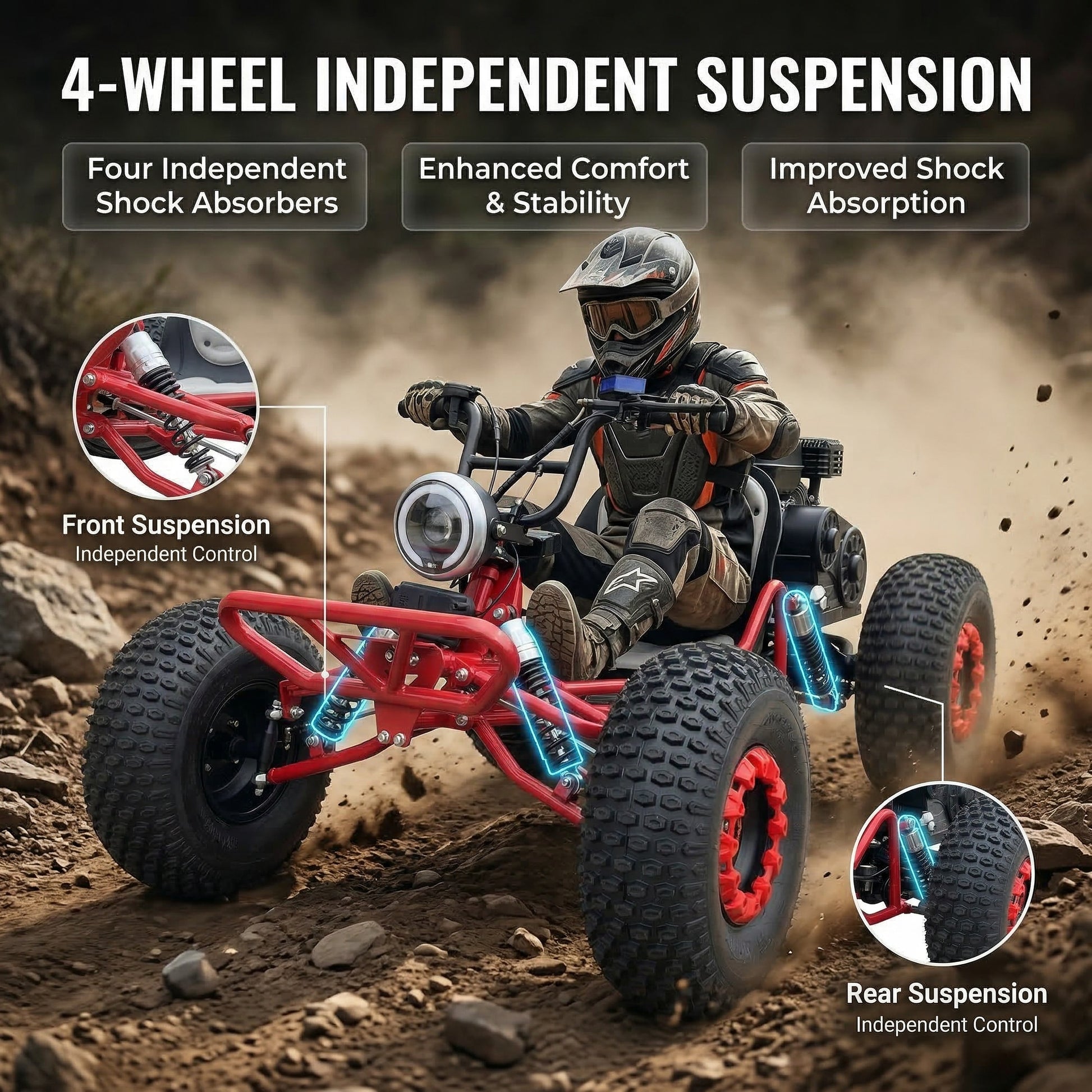 AT19x7-8 all-terrain tires provide confident traction and rollover ability on mud, gravel, grass, rocky paths, and sand (traction varies by surface). 4-wheel independent suspension absorbs bumps and ruts for a smoother, more enjoyable ride—perfect for weekend trail adventures.