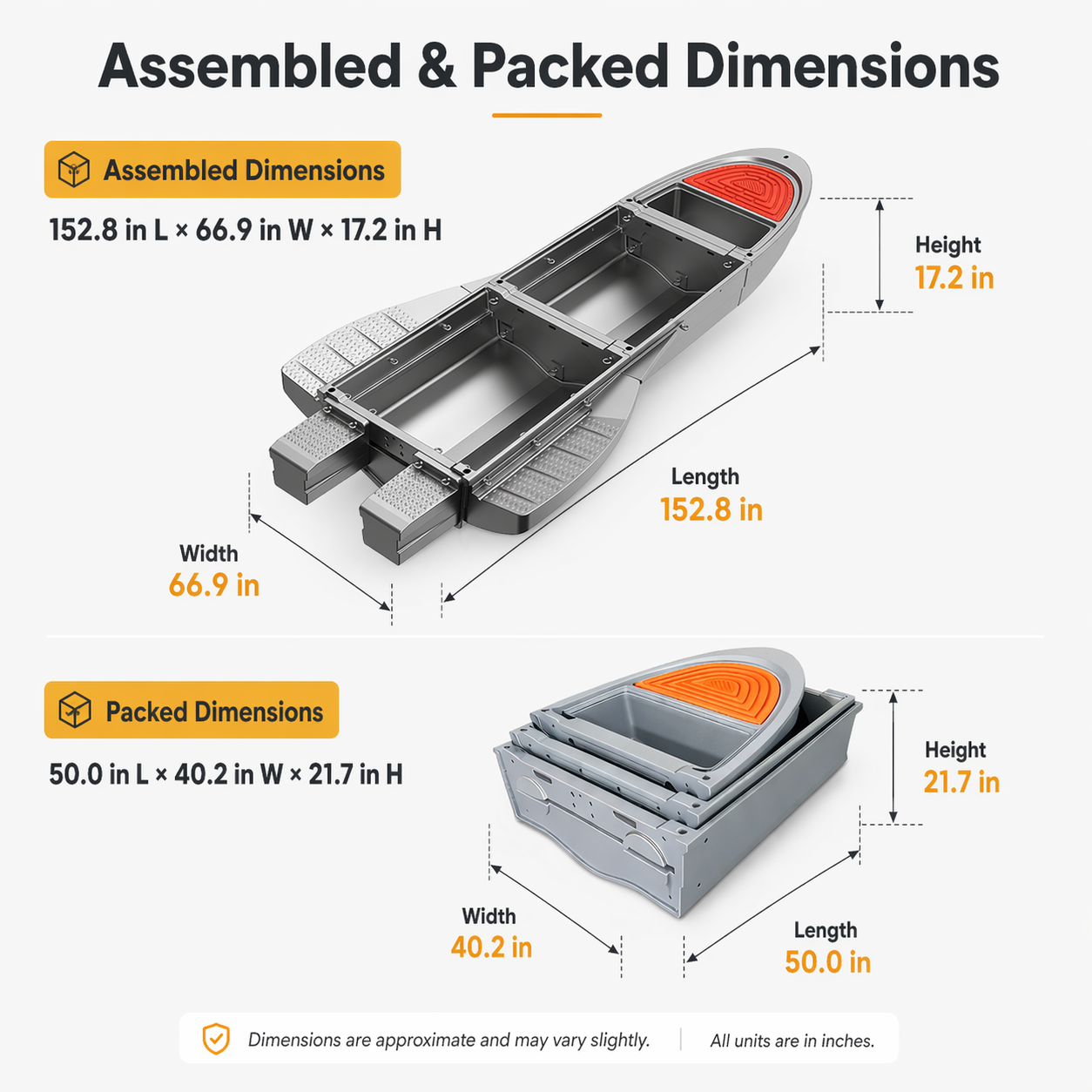 Made from heavy-duty PE material, the rigid hull is built for repeated outdoor use, water exposure, and abrasion resistance. Ideal for calm lakes, ponds, marsh area, camping lake access, and private-property water recreation. Always wear a life jacket and follow local boating rule.
