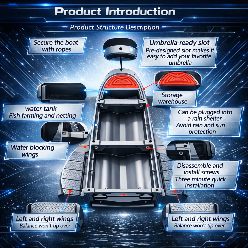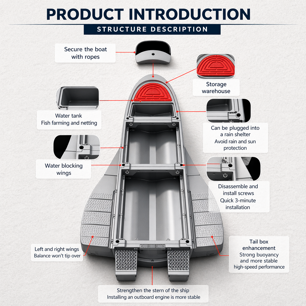 Built with a wide PE hard hull structure, this 12.7 ft modular fishing boat supports up to 1200 lb, giving anglers and outdoor users a roomy platform for fishing gear, cooler, tackle box, and daily water-use equipment.