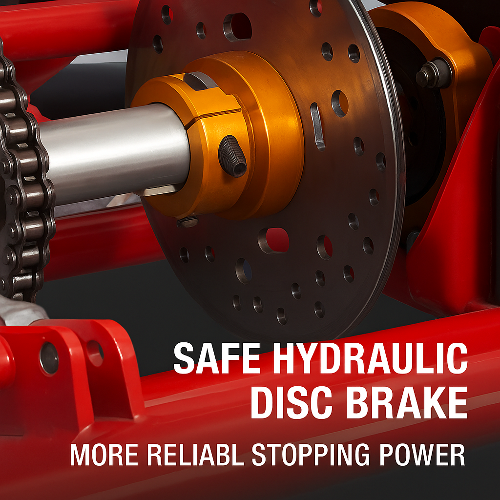 - Hydraulic Rear Disc Brake & Oversized Tires – Offers enhanced braking performance and better traction on dirt, gravel, and uneven ground
